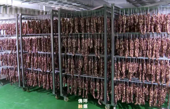 车间内,自动化设备高速运转,身穿无菌防护服的工人们分工明确、有条不紊,切割、腌制、灌装、捆扎……一道道工序环环相扣,动作娴熟利落,完成灌制捆扎的香肠,被送入冷烘车间,一排排香肠整齐悬挂,低温慢烘沉淀风味、紧实肉质,再经包装后,最终成为风味浓郁的年货佳品。