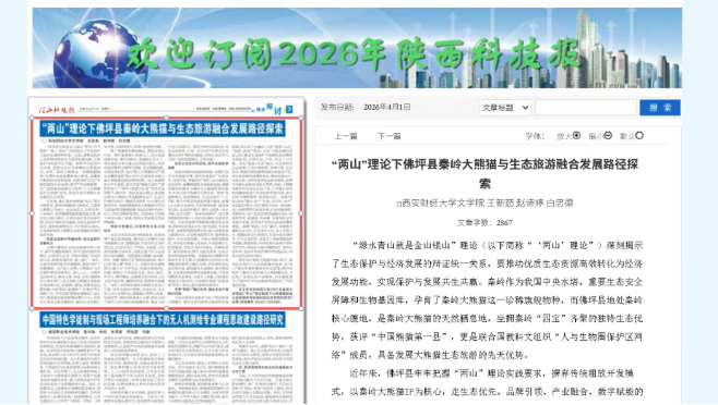 “绿水青山就是金山银山”理论(以下简称“‘两山’理论”)深刻揭示了生态保护与经济发展的辩证统一关系,要推动优质生态资源高效转化为经济发展动能,实现保护与发展共生共赢。秦岭作为我国中央水塔、重要生态安全屏障和生物基因库,孕育了秦岭大熊猫这一珍稀旗舰物种,而佛坪县地处秦岭核心腹地,是秦岭大熊猫的天然栖息地,坐拥秦岭“四宝”齐聚的独特生态优势,获评“中国熊猫第一县”,更是联合国教科文组织“人与生物圈保护区网络”成员,具备发展大熊猫生态旅游的先天优势。