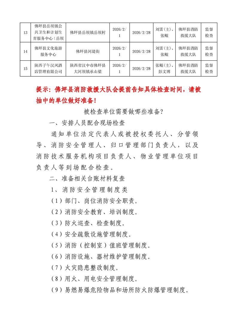佛坪县消防救援大队2026年2月全县“双随机、一公开”抽查计划