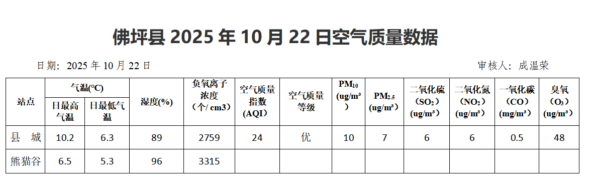 佛坪县2025年10月22日空气质量数据