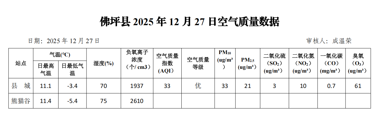 佛坪县2025年12月27日空气质量数据