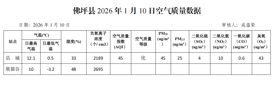 佛坪县2026年1月10日空气质量数据