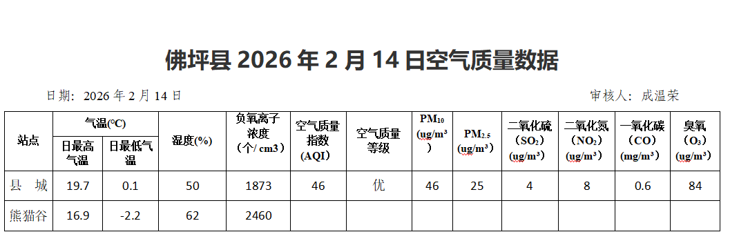 佛坪县2026年2月14日空气质量数据