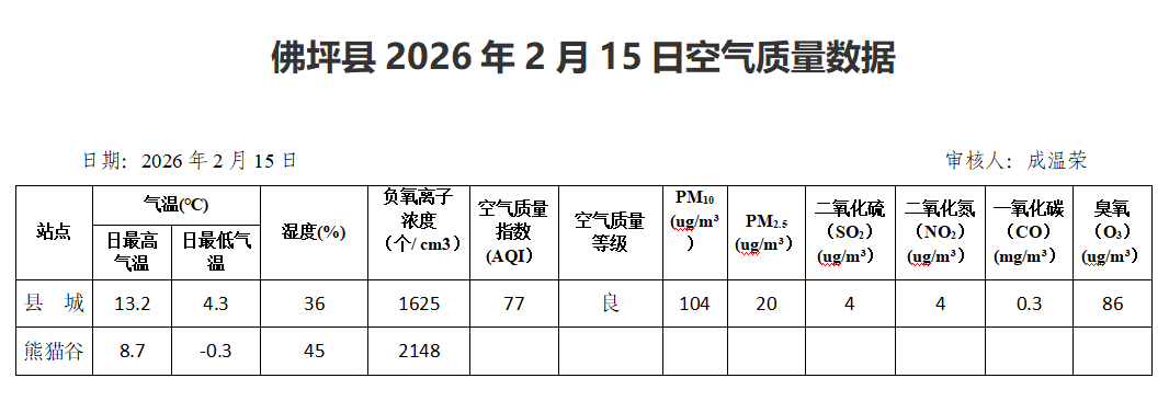 佛坪县2026年2月15日空气质量数据