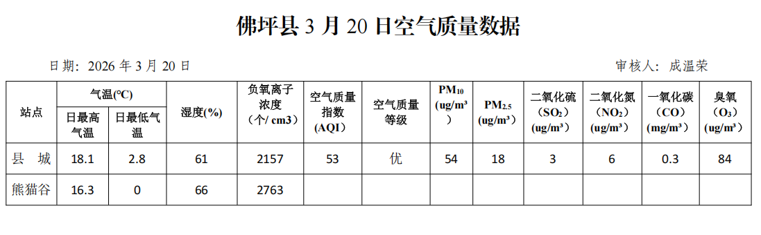 佛坪县2026年3月20日空气质量数据