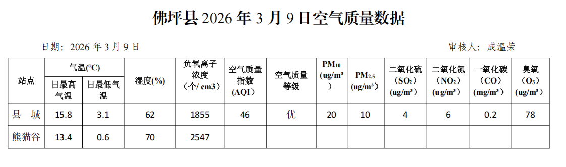 佛坪县2026年3月9日空气质量数据