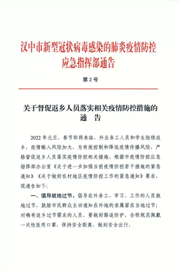 2022年春节即将来临,外出务工人员和学生陆续返乡,疫情输入风险加大,为有效控制和降低疫情传播风险,严格督促返乡人员落实疫情防控相关措施,根据市疫情防控应急指挥部办公室《关于进一步加强当前疫情防控若干措施的紧急通知》《关于做好农村地区疫情防控工作的紧急通知》要求,现通告如下: