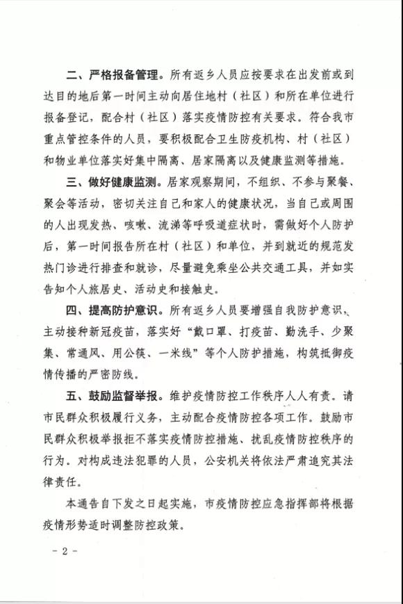 二、严格报备管理。所有返乡人员应按要求在出发前或到达目的地后第一时间主动向居住地村(社区)和所在单位进行报备登记,配合村(社区)落实疫情防控有关要求。符合我市重点管控条件的人员,要积极配合卫生防疫机构、村(社区)和物业单位落实好集中隔离、居家隔离以及健康监测等措施。