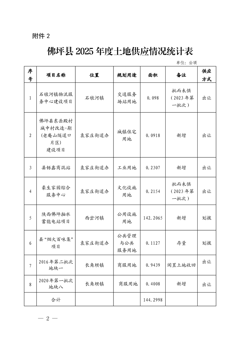 佛坪县2025年供地计划范围,原则上为本年度能够完成征地拆迁并达到供应条件的地块。供应计划总量8个地块,面积共计144.2998公顷,拟计划在2025年分批次按时序全部安排供应。供应方式为划拨和出让两种形式,其中:以划拨方式供应2个地块,供地规模142.3192公顷,规划用途以公共设施和公共管理与公共服务用地为主;以出让方式供应4个地块,供地规模1.9806公顷,规划用途以工业用地和文化设施用地为主。土地来源分为批而未供地块和新增储备用地,其中:批而未供地块共2个,面积0.3134公顷,均为2023年第一批次农用地转用土地征收地块;新增储备用地共6个,面积143.9864公顷。详情见附件6。