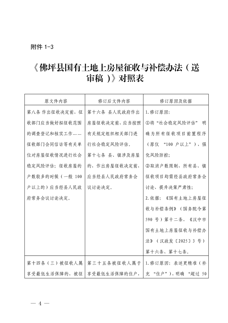为规范国有土地上房屋征收与补偿活动,维护公共利益,保障被征收房屋所有权人(以下简称被征收人)合法权益,根据《国有土地上房屋征收与补偿条例》(国务院令第590号)、住房和城乡建设部《国有土地上房屋征收评估办法》(建房〔2011〕77号)、《汉中市国有土地上房屋征收与补偿办法》(汉政发〔2025〕3号)等规定,起草了《佛坪县国有土地上房屋征收与补偿办法》(征求意见稿),现面向社会公开征求意见和建议。
