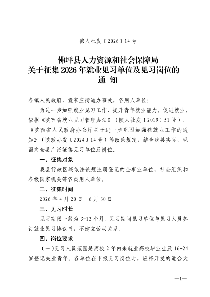 佛坪县人力资源和社会保障局关于征集2026年就业见习单位及见习岗位的通知