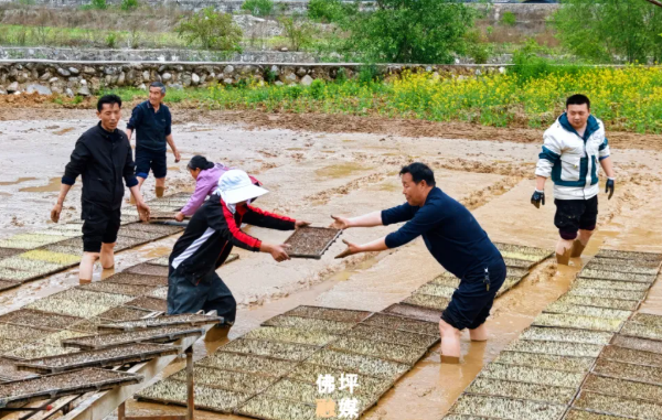 在老党员带头示范、冲锋在前,志愿者主动补位、协同配合,村民踊跃参与、自发上阵的合力推动下,金星村育秧现场忙碌而有序。大家赤脚踩在泥泞的田块里,从秧田整地、流水线摆盘,到秧盘归集、转运储备,每一道工序都有条不紊。田间地头,“你摆盘、我铺膜、他转运”的火热劳动场面随处可见。一排排整齐划一的育秧秧盘在方寸秧田之间有序铺开,忙碌的身影与春日金黄的油菜花海交相辉映。