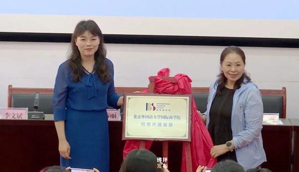 仪式上,北京外国语大学国际商学院学生、委内瑞拉留学生和佛坪中学学生分别作了发言。王晴、李春丽与李文斌、赵振兴分别为校地共建基地、留学生社会实践基地揭牌。