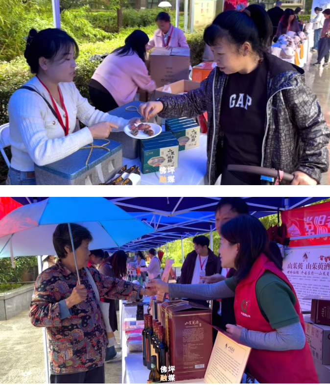 现场还设置了美食品鉴环节,居民们被阵阵香味吸引,争相驻足品尝。一杯杯分装好的山茱萸酒、一片片切好的猪肉肠吸引了很多居民,展销台前排起长队。