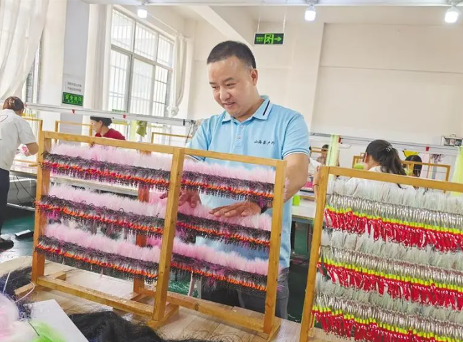 工厂负责人谭庆宏拿起一枚缠着绿丝线的鱼钩,越看越满意:“彩线缠得密,辫子扎得结实,一个线头都没有。”