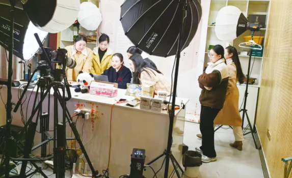 公司的直播间同样热闹,货架上的产品琳琅满目,一名主播正在屏幕前热情推介。