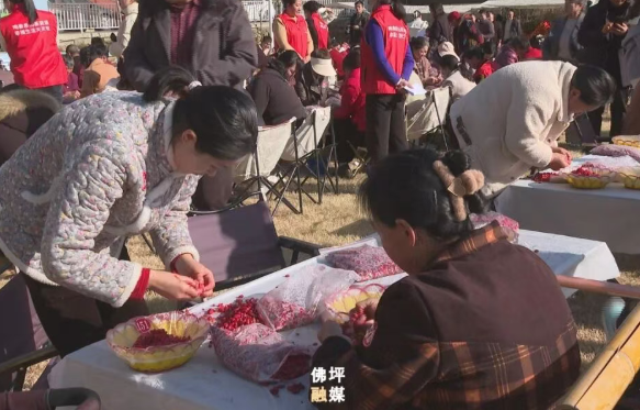 大赛在舞蹈《当那茱萸红》中拉开帷幕,情景表演《佛坪好物推介》《山茱萸酒赞》展现佛坪物产与茱萸文化魅力,歌曲《等待》为冬日现场添暖升温。随着裁判长宣读规则、参赛代表宣誓,“挤枣皮”技艺对决正式开启。
