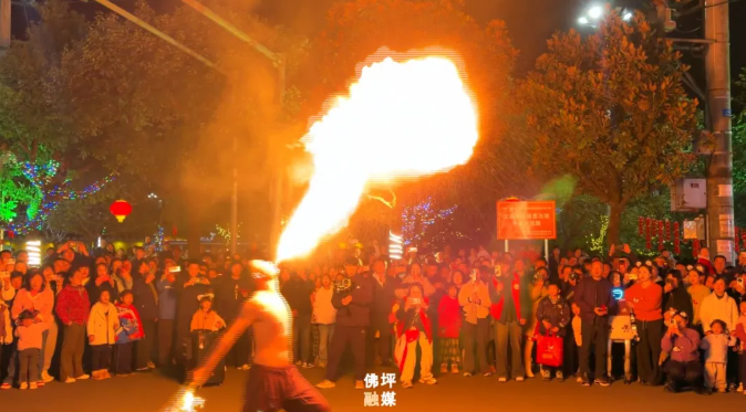 伴随着欢快的锣鼓声,长龙与数头雄狮在桥头广场率先登场,翻腾起舞,瞬间点燃了现场的热烈气氛。紧随其后的智慧旅游机器人方阵,以科技感十足的武术和舞蹈表演,引得观众阵阵喝彩。非遗技艺者带来的喷火绝技,更是将现场气氛推向高潮,火焰在夜空中划出绚丽弧线,寓意着新的一年红红火火。