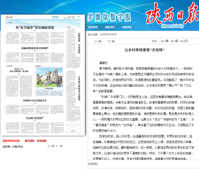 春节期间,佛坪县大河坝镇、陈家坝镇等镇的10余个村热闹非凡,一场场别开生面的“村晚”精彩上演,尤其是西岔河镇西岔河村的30名村民还投身写村史活动。与此同时,多地的民俗节目、非遗展演也轮番登场,共同掀起了一股乡村年俗文化的热潮。这些传统与现代融合的活动,让年味成为更具“烟火气”和“文化味”的新春盛宴。