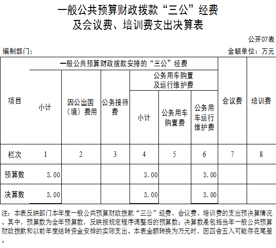 3.“三公”经费:指部门使用一般公共预算财政拨款安排的因公出国(境)费、公务用车购置及运行费和公务接待费支出。
