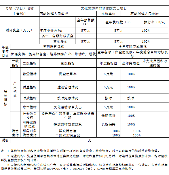 根据年度设定的绩效目标,部门整体支出自评得分100,综合评价等级为“优”(良、中、差),全年预算数744.54万元,执行数744.54万元,完成预算的100%。本年度本部门总体运行情况及取得的成绩:全力保障机关运行,保障干部职工工资发放,保障基本民生;组织各类节庆文娱活动,提高全镇文化活动氛围;保障无收入、低收入以及遭受各种意外灾害的群众的基本生活不受影响,保障集镇环境卫生、节能环保等;持续加大农业建设投入,对农业、林业、水利发展起了极大的推进发展作用;为洪涝灾害后道路塌方等提供资金保障,以及对汛期撤离人员进行生活补助,增强了面对灾害防治及应急管理的能力。发现的问题及原因:因项目调整及相关费用增大等原因导致预算增加。下一步改进措施:严格遵守中央八项规定,严格资金支出管理,压缩资金支出规模,规范预算申报科目,详细分类,力争做到精准预算。