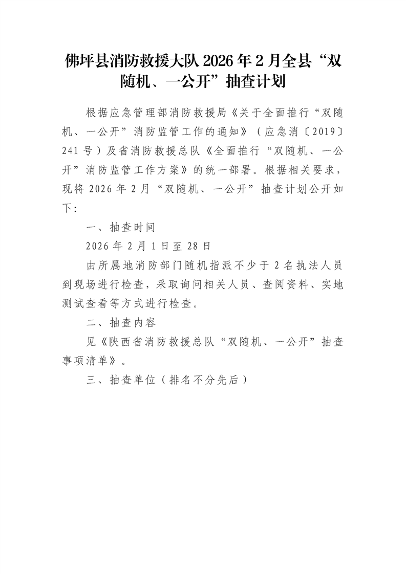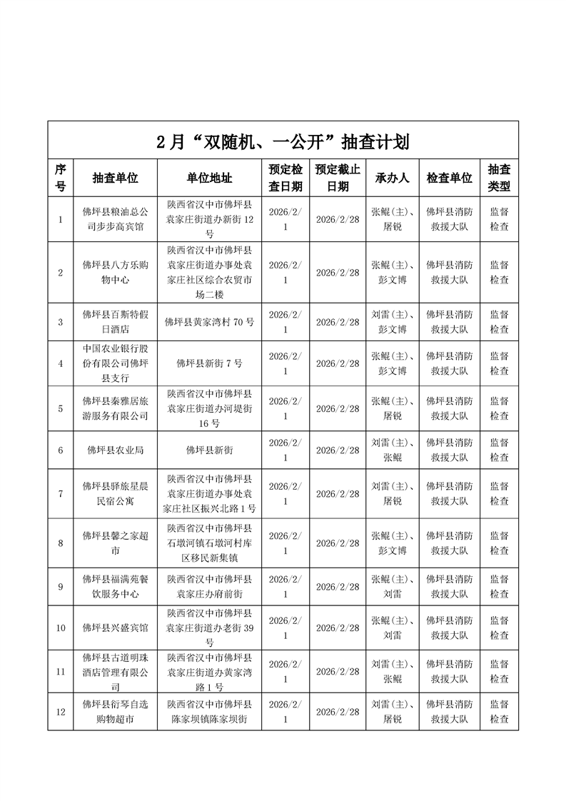 佛坪县消防救援大队2026年2月全县“双随机、一公开”抽查计划