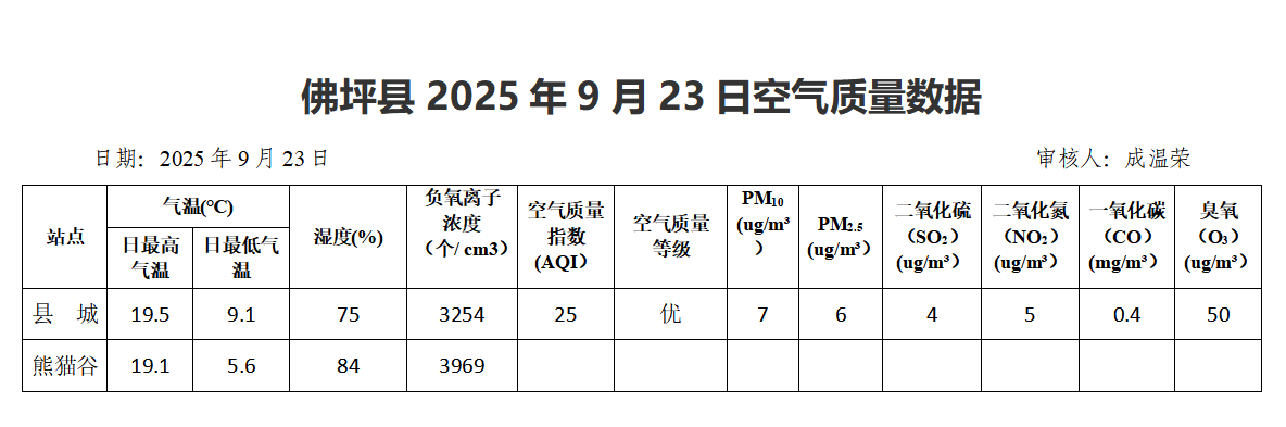 佛坪县2025年9月23日空气质量数据