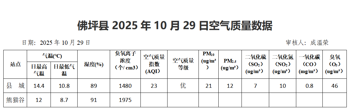 佛坪县2025年10月29日空气质量数据