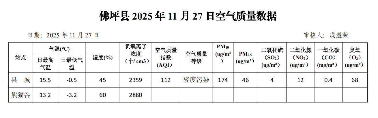 佛坪县2025年11月27日空气质量数据