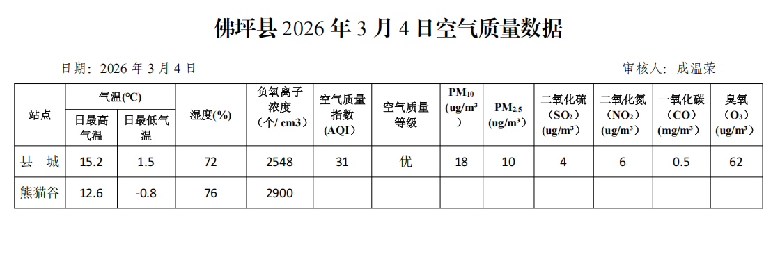 佛坪县2026年3月4日空气质量数据