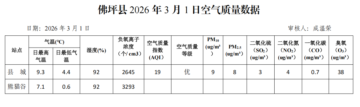 佛坪县2026年3月1日空气质量数据