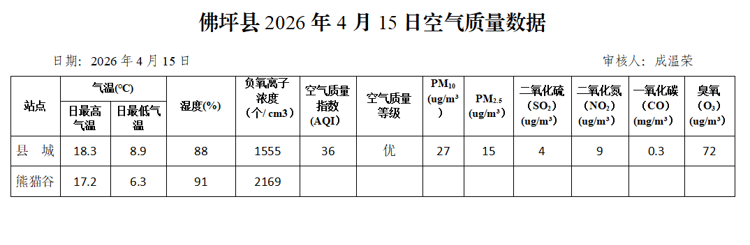 佛坪县2026年4月15日空气质量数据