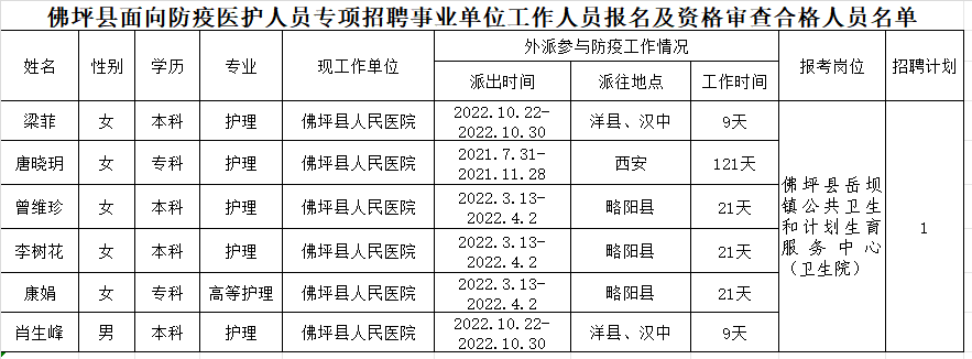 附件:佛坪县面向防疫医护人员专项招聘事业单位工作人员报名及资格审查合格人员名单