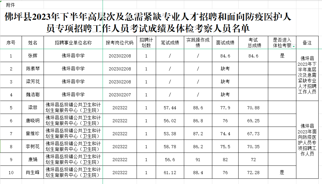 附件:佛坪县2023年下半年高层次及急需紧缺专业人才招聘和面向防疫医护人员专项招聘工作人员考试成绩及体检考察人员名单