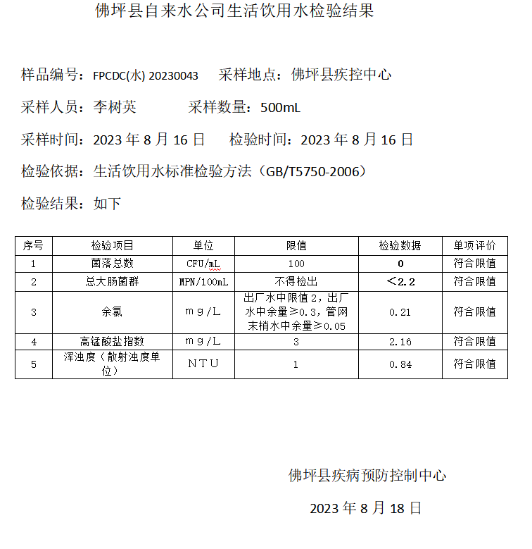 为保证我县生活饮用水安全,保障人民群众健康,根据《中华人民共和国传染病防治法》及《生活饮用水卫生监督管理办法》的有关要求,现将2023年8月对陕西省水务集团佛坪县供水有限公司生产的生活饮用水水质卫生检测结果公示如下,请广大群众予以监督。