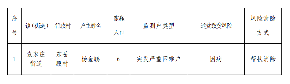 根据《佛坪县健全防止返贫动态监测和帮扶机制的实施细则》(佛农工发〔2021〕5号)文件要求,我县对石墩河镇拟上报的监测对象风险消除户1户6人进行了审定,同意杨金鹏1户6人监测对象风险消除,现予以公告(名单附后)。