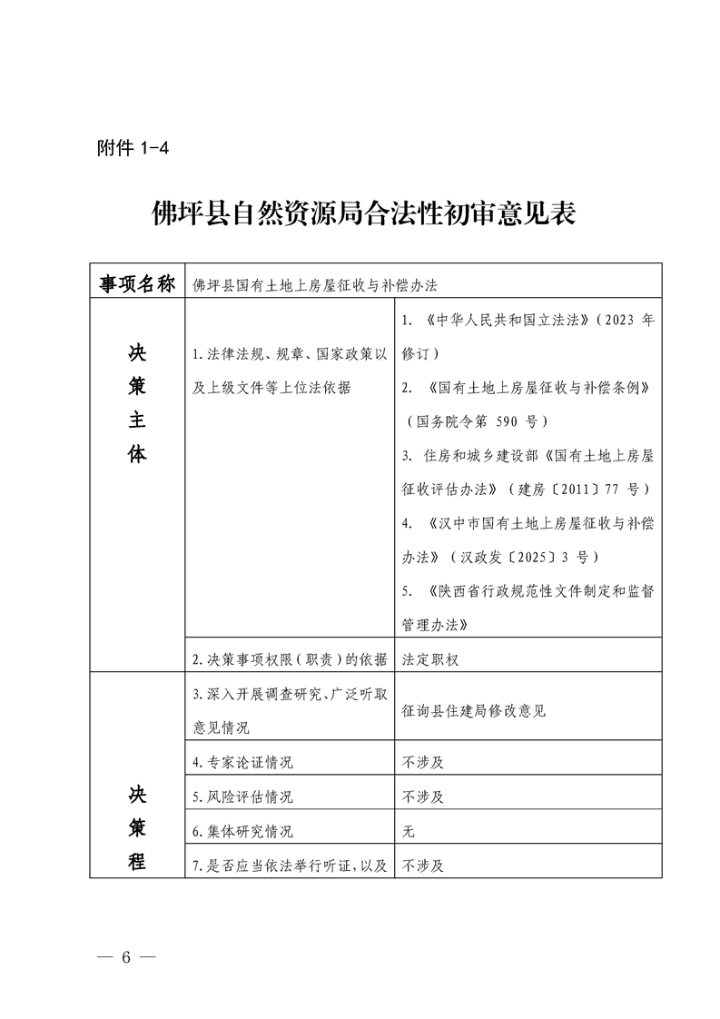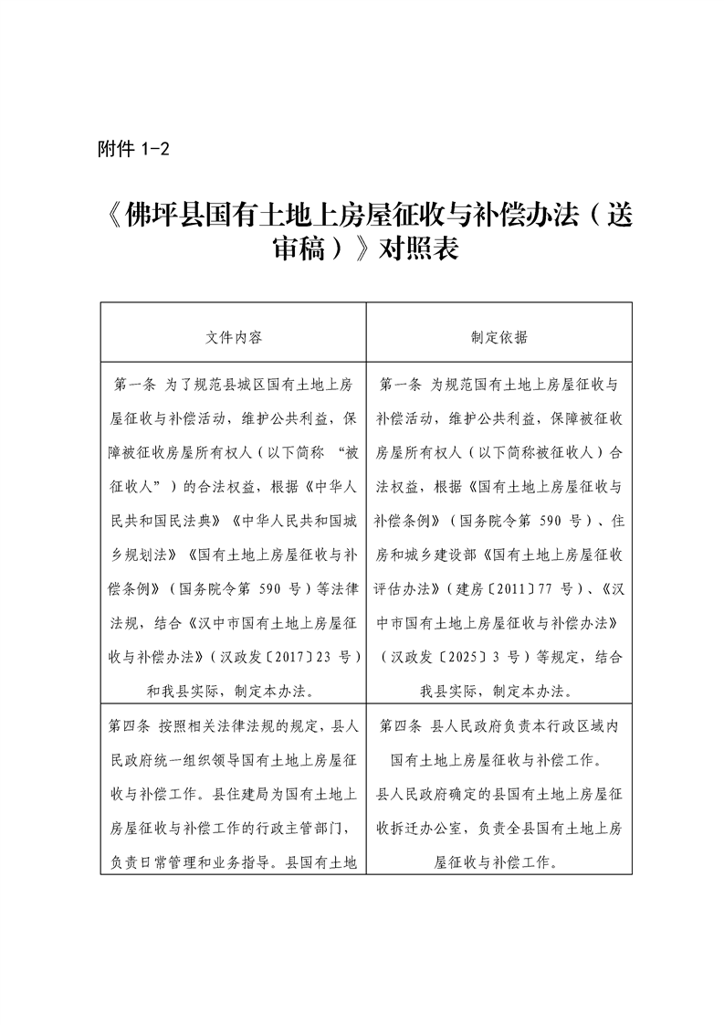 (一)承办部门调研、起草等情况:由佛坪县自然资源局牵头,县住建局共同参与,对照汉中市办法,结合本县实际梳理细化条款,形成《佛坪县国有土地上房屋征收与补偿办法》。