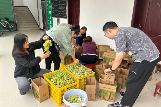 为了让这份“沙坪香甜”走得更远,村里早早谋划多元销售路径,交出了一份亮眼答卷。休闲采摘是“近距离吸客”的关键——开放大棚一个月,饶是雨季就吸引周边游客超200人次,游客亲手挑选新鲜葡萄,在亲近自然中感受采摘乐趣,带动零售销量达500余斤;线上销售同样势头强劲,村里主动对接县电商协会,邀请专业团队开展现场直播带货,累计观看人数超1万人次,线上订单突破200单,成功将沙坪葡萄销往全国各地;此外,包扶单位陕飞公司积极开展消费帮扶,一次性采购500斤,县级10余个部门工会集中采购1000斤,政企同心帮销,在多方助力下,目前,沙坪村阳光玫瑰已售出超2300斤,销售率突破65%,不仅打开了市场,更让村民的辛勤付出收获了丰厚回报。从田间地头的精心培育,到多元渠道的新鲜直达,沙坪村的阳光玫瑰,不仅是一串甜美的果实,更是乡村振兴的“甜蜜答卷”。