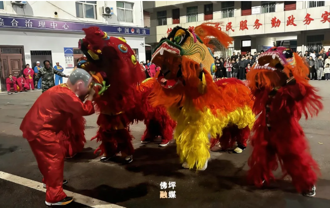 伴随着“咚咚锵、咚咚锵”的铿锵锣鼓声,民俗表演正式拉开帷幕。舞狮队身着喜庆盛装,四头威风凛凛的大狮子昂首挺胸、气势不凡,两头小巧灵动的小狮子紧随其后、憨态可掬,在笑脸和尚的娴熟操控下,狮群时而摇头摆尾、时而蹬腿跳跃、时而俯身作揖向围观群众送上新春祈愿。精彩的互动引得村民主动伸手触摸狮身,期盼新的一年开工顺遂、平安喜乐。