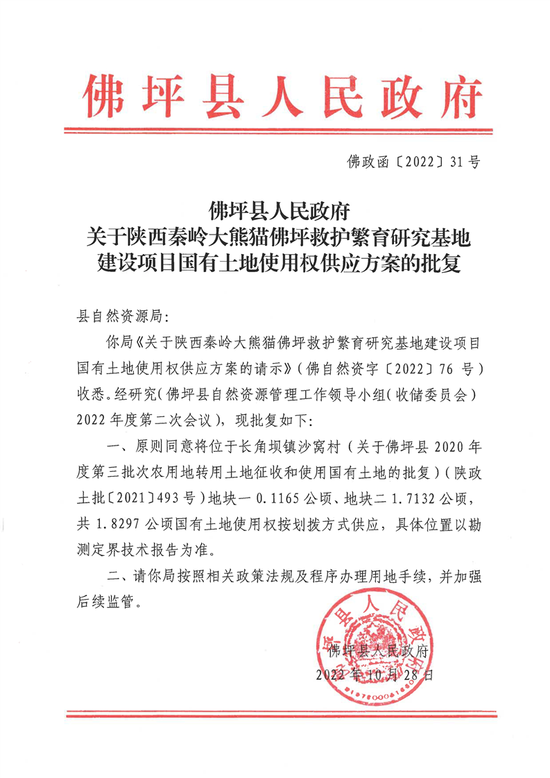 陕西秦岭大熊猫佛坪救护繁育研究基地供应方案批复