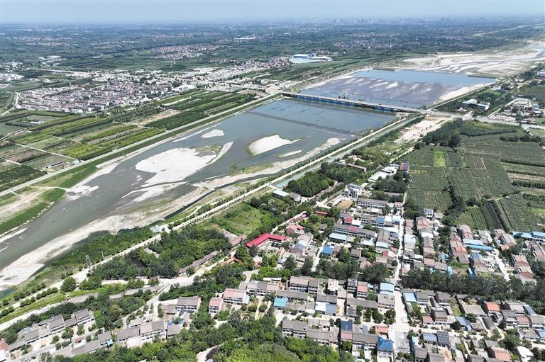 黄池沟配水枢纽旁的黑河景色(7月16日摄,无人机照片)。引汉济渭工程引来的一部分汉江水,将从这里流入黑河,并最终汇入渭河和黄河,润泽关中大地。