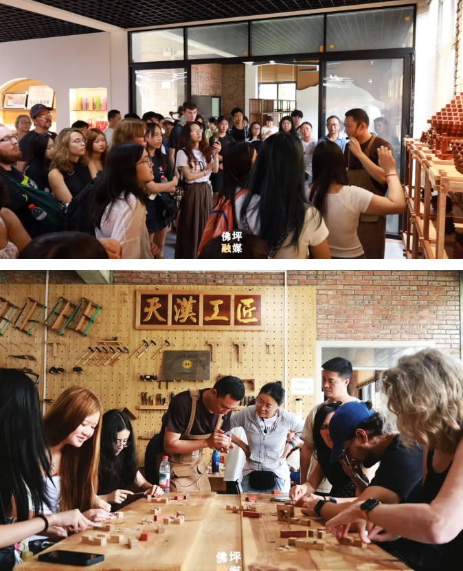 非遗传人戴朝禧详细地为采风团成员们讲解榫卯技艺,不少成员还亲手尝试制作,体验其中的乐趣,用榫卯技术做成的鲁班锁、机关盒这些凝结着中国古人千年匠心的精妙哲思让大家赞叹不绝。